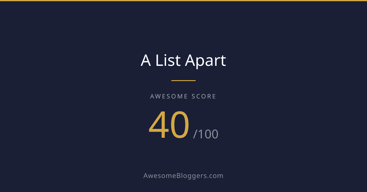 <a href="https://www.awesomebloggers.com/blog/a-list-apart" target="_blank" rel="noopener"><img src="https://www.awesomebloggers.com/api/badge/a-list-apart?w=150" alt="A List Apart — Awesome Score 40/100" width="150" /></a>Paste this in your blog’s sidebar or footer.
